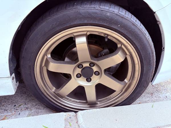 Like new. Used for a year. See pics for condition. Excellent overall. Tires ahve 75% tread left, driven less than 10,000 miles. Just sold the car so don’t need the rims/tires anymore. As close I could afford to get to volk te37.