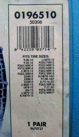 Model # 0196510 for light trucks/SUVs. See second photo above for the complete list of tire sizes they fit. Nice set of Peerless Traction Tire cables/chains for snow. Fits most 14-17" tires. Tire sizes listed on front of package in picture. Like new with original storage box.
