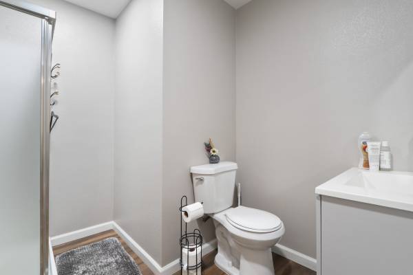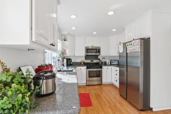 The floor plan is open and bright. The main level includes vaulted ceilings, a formal living room with wood flooring, and a family room with built-ins and a brick fireplace. The remodeled kitchen features white cabinetry, granite counters, stainless steel appliances, and a breakfast bar that opens to the dining area.