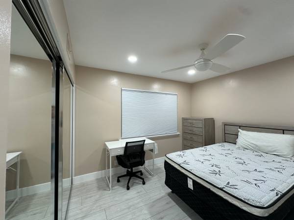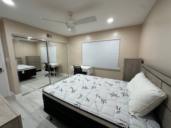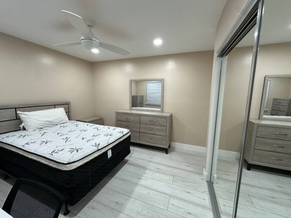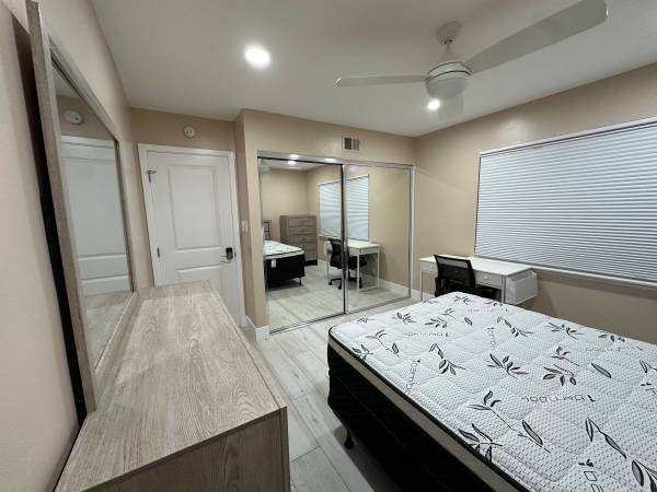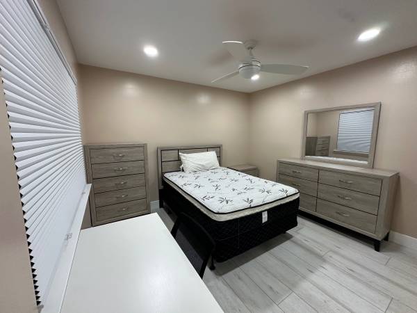 The room comes furnished with a full size bed, a mirrored chest dresser, a 5 drawers dresser, one night stand, one desk, and one chair. There is a large closet for storing your clothes.