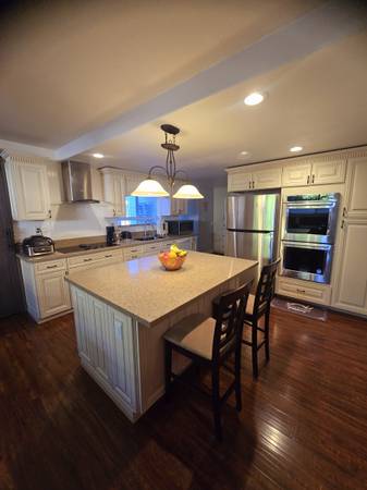 Nice remodeled kitchen features double ovens, microwave, full size frigerator, stove top range. Kitchen island with breakfast bar.