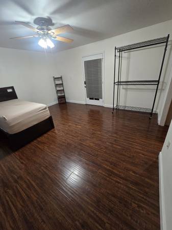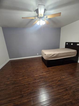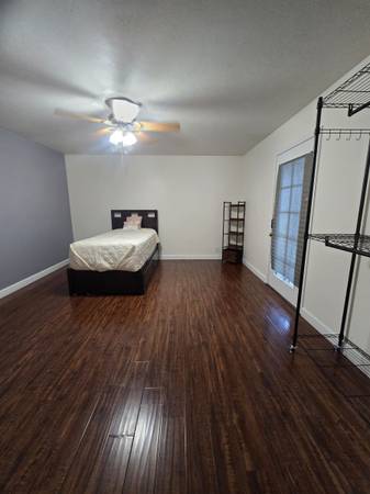 This room has direct private entry. The room is very spacious measuring 18ft by 15ft with newer wood flooring and paint. Ceiling fan with light.