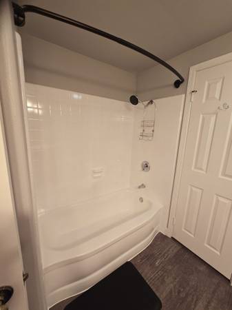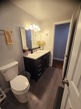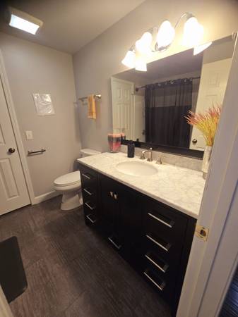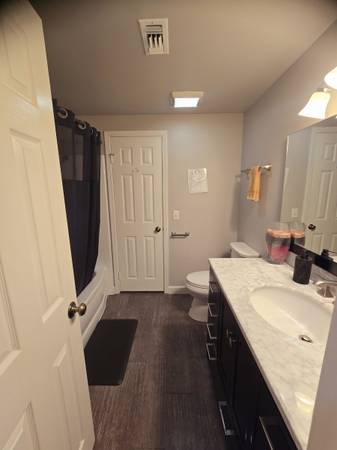 The shared bathroom has nice lighting, newer wood flooring and paint. New shower with tub, toilet, vanity and sink.