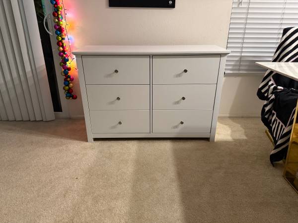 Please look at the photos and you will see a white dresser, that will be in the room. You will also see a grey bed with headboard, that will also be going into the room ( we are putting it together)
