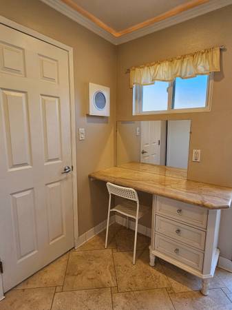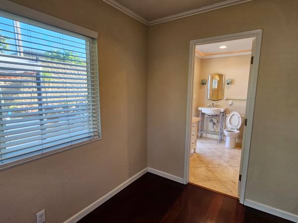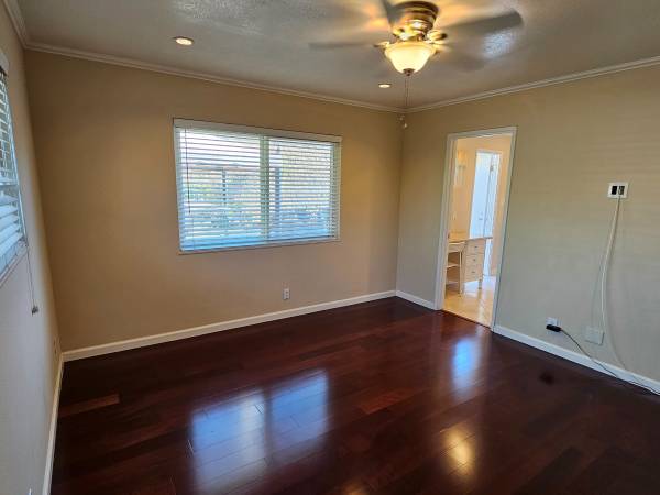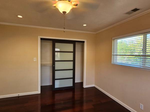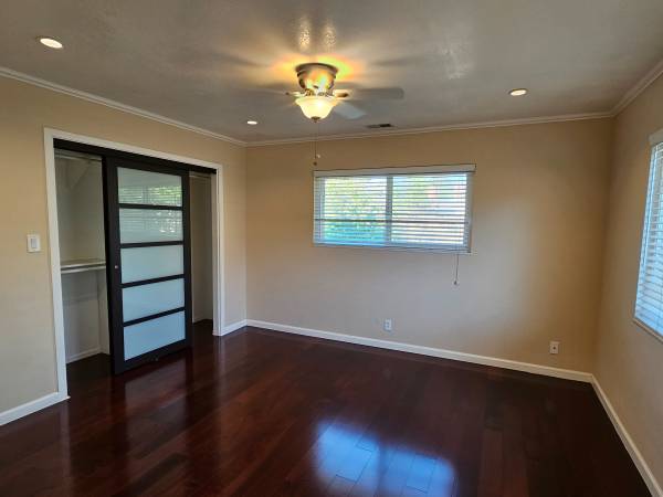It is a 163sqft (12.5ftx13ft) master bedroom with a private entrance in a 3 bedrooms + 1 patio room + 2 bathrooms single family house. The house is at the cul de sac with a lot of privacy and street parking. The bedroom comes with a big 22.5 sqft (2.5ftx9ft) closet. The huge bathroom 86 sqft (9ftx9.5ft) has a make up table which can be used as a working table too and is used as the entrance to the bedroom. Bedroom can be furnished with a queen bed if needed. Cooking will be in the awning in the backyard. Living room and the main kitchen are not shared to the tenant.