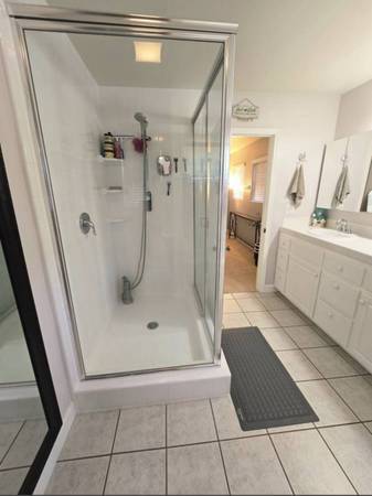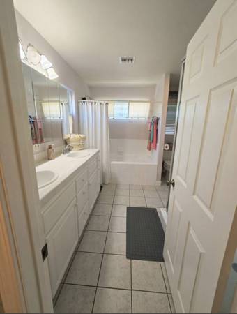The master bathroom is 15ft by 10ft with ceramic tile flooring, tall cabinets, double sinks, wide mirror with storage.