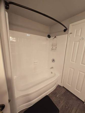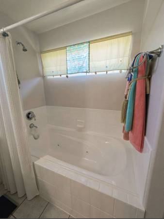 Stand-up shower and a second shower/ jacuzzi tub with jets. Bright and dim lighting. Great ventilation with a fan and three windows.