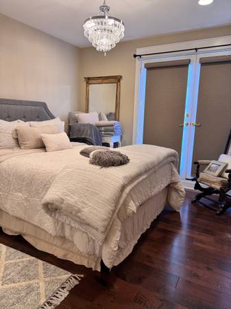 Home has air conditioning for those hot days. Home is located 3 miles from the beach near the cross streets of Bushard in Yorktown. Must love dogs. They are mostly in the backyard and in my bedroom, but I do allow them in the living room and kitchen area now and then so we must love dogs.