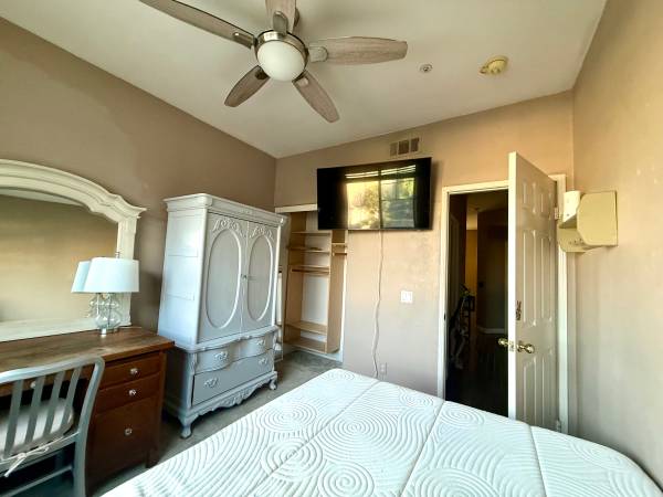 Fully furnished room available. In a 3bd 2.5 bath townhouse. In a gated community. 2 miles from the Huntington Beach pier. 11 min walk to Trader Joe’s. Room is 10’x10’ with plenty of closet space. Flooring is carpet. Faux wood blinds. Ceiling fan with light. Queen memory foam mattress. 50” Samsung smart tv. With the option of painting the room. Room can be rearranged. Shared bathroom with female roommate. Other roommate is male. Both working professionals. On-site laundry. Hardwood floors through out the house. Central air conditioning. Full use of kitchen with stainless steel appliances. $300 deposit. All utilities included in the rent. No animals. No couples.