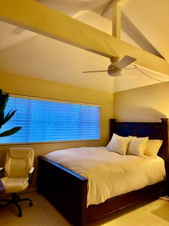 Room rental in extremely desired "SURF CITY" Huntington Beach! Luxurious furnished bedroom month to month room rental. 11 x 12 square feet with vaulted ceiling (includes Smart TV, QUEEN SIZE bed/bedding/ 6 drawers and small desk) has mirrored closet doors. PRIVATE adjacent bathroom in a 2236 square foot townhome owner (2) occupied located in lushly landscaped, beautiful and safe 24 hour guard gated community with swimming pool and jacuzzi right outside your door and just a 10 minute walk to the beach. Convenient laundry upstairs next to bedroom. 5 minutes north of the Huntington Beach Pier and 15 minutes west of the 405 freeway. Parking inside the gated community with decal sticker/transponder for $50 annual fee. $1500. per month also includes standard cable, gas, electric, water/trash, and internet. No pets or smoking. Due to the large number of robot calls I get, please TEXT or email first to inquire. If interested, we set up a FaceTime call to show you around the house and if you are still interested, we can set up a meeting. Our last room renter was planning on staying 3 months yet ended up staying 5 years. Seven one four, four five seven, nine eight one five. I'll get back to you in the evening. Toni