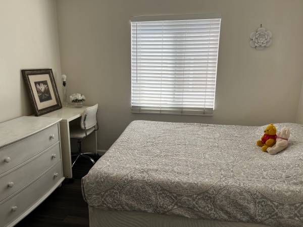Beach House, one furnished room with shared bathroom and big closet, useful stuff including desk, chair, bed and mattresses, night stand, dresser, desk light, microwave, share Landry and kitchen, walk to beach no over 0.2 miles and supermarket and shopping mall and pier no over 2 miles. Free use community swimming pool, spa, gym. Summer is coming. Let’s go to beach for fun!