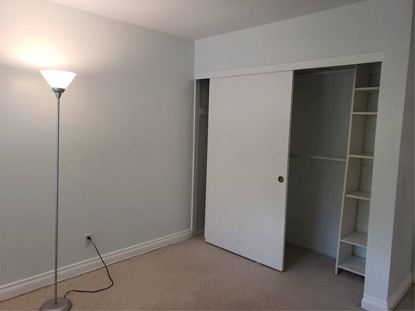 * Closet: custom built-in - Wooden shelves at various levels from folded to hanging clothes (replaces the need for a dresser)- plenty of storage