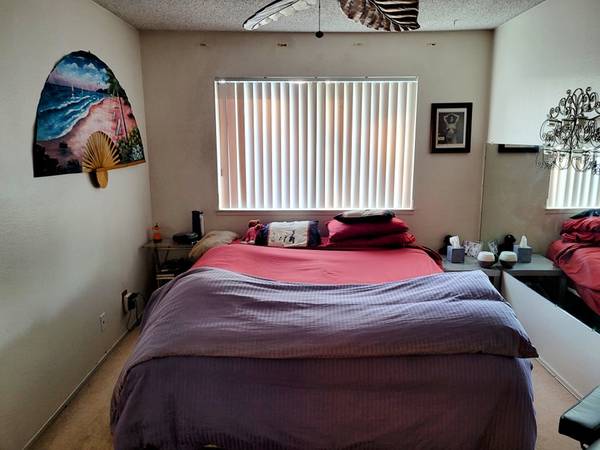 Furnished (bed, TV, dresser, walk-in closet) private room is available February 1. Looking for an extra roomy in a 3-bedroom townhouse. All utilities are paid for. Male or Female will do. There is NO DRAMA allowed in the house. Responsible alcohol drinking is fine. Bedrooms are upstairs. CIGARETTE SMOKERS or ADDICTS of any kind need NOT APPLY. Full privileges. Ceiling fans in all rooms of the home. Laundry is in-house and fast WIFI. Direct TV, DVR in all rooms. I just require one simple payment each month of $1,250. There's also a $1,250 security deposit to move in. You must have $2,500 total to move in. 2 bathrooms (both shared). Patio, BBQ. Best fit would be: clean, quiet with a 40-hours/week job, probably 35 years and older. No working from home, must have a job outside of the home. No couples, kids or pets. IF you have a positive vibe in life (no anger or depression issues) and love sports/exercise, this is your place, please text or call show contact info