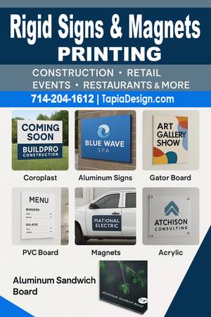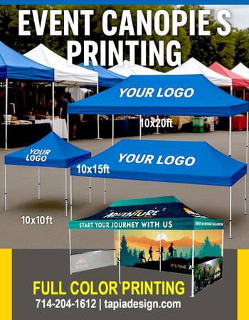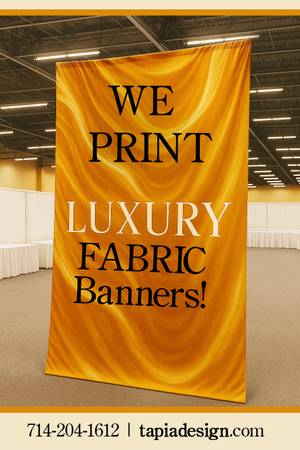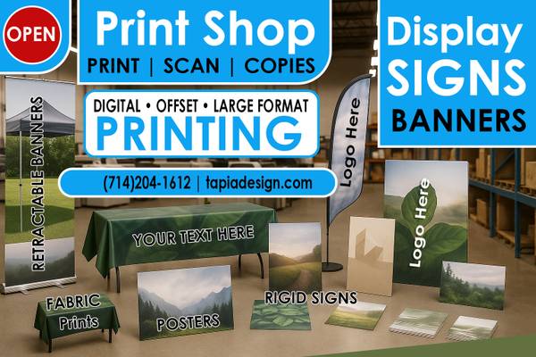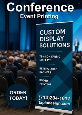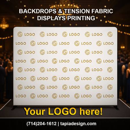 We Specialize in Display Signs: Step and Repeat, Backdrop, Tension Fabric Displays, Trade Show Booths, Fabric Banners, Vinyl Banners, Retractable Banners, Catalogs / Booklets, Sales Sheets, Postcards, Brochures, Board Signs, Vinyl Large Stickers, Advertising Flags, Event Table Covers, Event Canopy Tents size 10x10ft,10x15f, 10x20ft, Promotional Items and more...