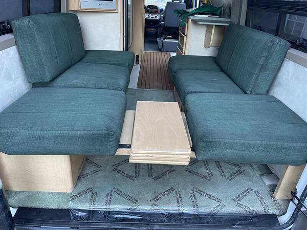 The driver and passenger seats and rear seating are all ultra-leather fabric. The front passenger seat swivels to provide an added sitting space when parked. the rear of the Plateau from a dining area during the day to a 74 x 68 queen bed at night.