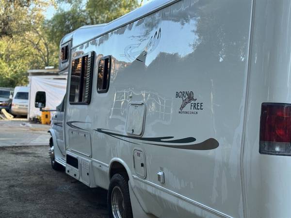 2004 Born Free 26RB - 26.5' bumper to bumper - 6.8L Triton V10 engine - Ford E450 chassis - 16 foot power awning - Tow package - 2 burner cooktop - Microwave/convection oven - The tires have date codes of 4521 - 4 seat belts - Generac 4k gas generator with 250 hours - Rooftop A/C - Ducted furnace - 24 inch LG flat screen TV - Holding tanks - Fully self contained - In the cabin area there are power windows, power locks, tilt, cruise, power heated mirrors, and CD player- This Born Free is ready to hit the highway