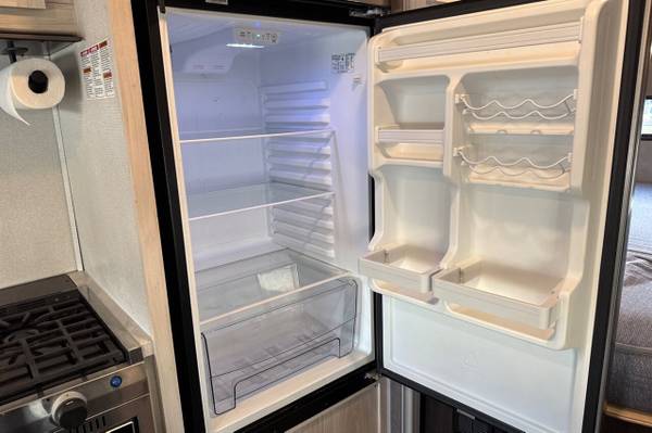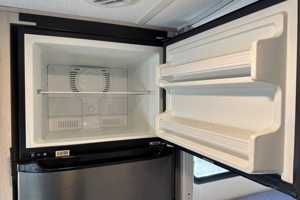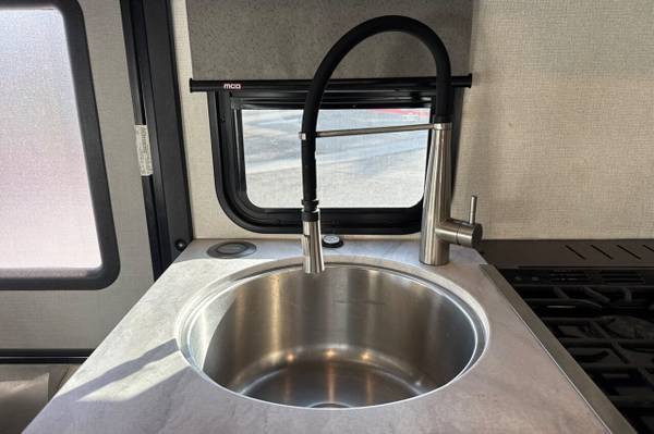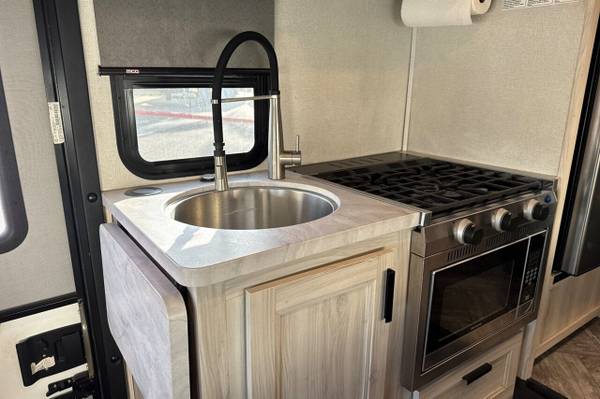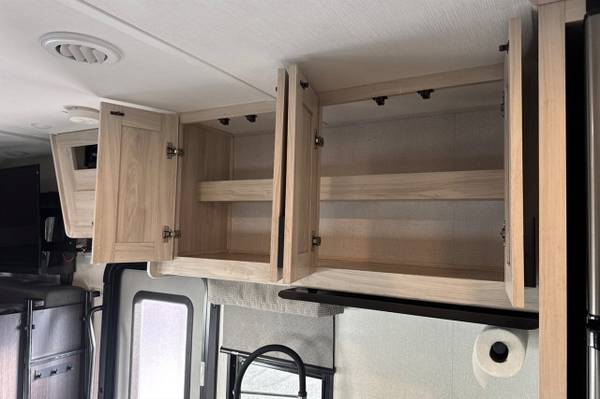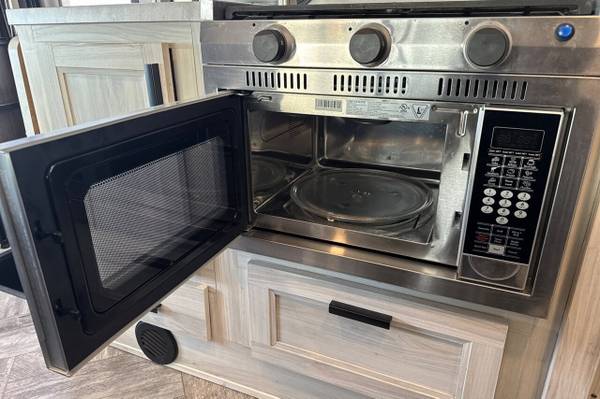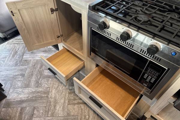 The kitchen is equipped with a three-burner cooktop, a microwave oven, and a refrigerator, providing everything you need to prepare meals on the go. Beautifully crafted cabinetry offers ample storage for cookware and pantry items, while a solid surface countertop provides a durable workspace. The kitchen area also features a double-basin sink with a pull-down faucet, making dishwashing easy and efficient.