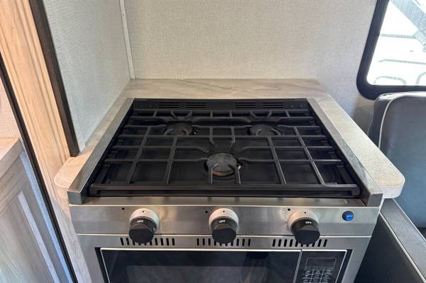 The vehicle is equipped with ample storage options, including pass-through storage compartments that allow for easy access to your gear. An exterior shower is also included, making it convenient to rinse off after outdoor adventures. The Sunseeker features a 4,000-watt generator, ensuring that you have power wherever you go, and an automatic leveling system that simplifies parking and setup at your destination.