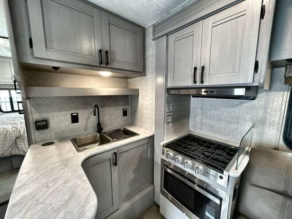 The living area features a cozy dinette that can be converted into an additional sleeping space, perfect for accommodating guests or family members. The well-equipped kitchen includes a three-burner range, microwave, refrigerator, and ample storage space for all your cooking essentials. Prepare delicious meals on the go and dine in style with the elegant cabinetry and countertops that add a touch of sophistication to the interior.