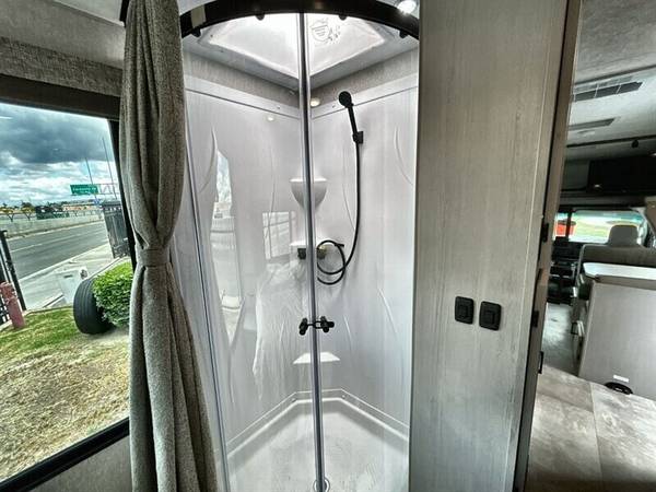 The bedroom is a peaceful retreat, featuring a comfortable queen-size bed with overhead storage and reading lights for added convenience. The spacious bathroom includes a shower, toilet, and sink, allowing you to freshen up after a day of adventure. With premium features such as a 32" LED TV, Bluetooth stereo system, and USB charging ports throughout the motorhome, entertainment is always within reach.