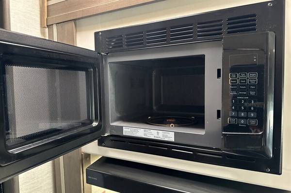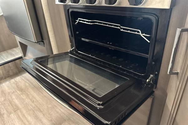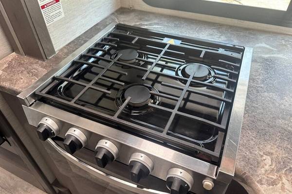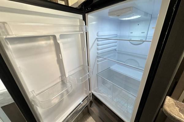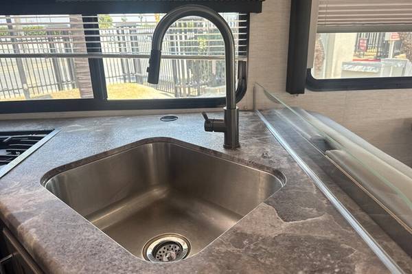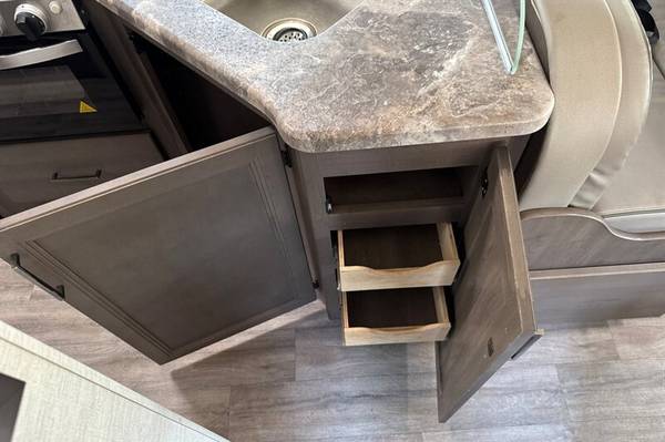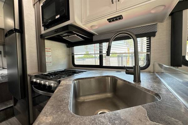 The living area features a comfortable sofa bed and a booth dinette, providing ample seating for you and your guests. The well-equipped kitchen comes with a three-burner gas cooktop, a microwave oven, a double-door refrigerator, and a stainless steel sink, allowing you to prepare delicious meals on the go. The solid-surface countertops and decorative backsplash add a touch of elegance to the space, making it feel like home away from home.