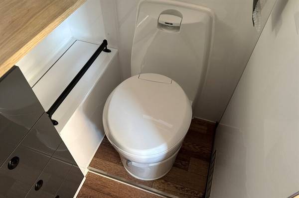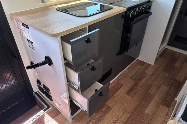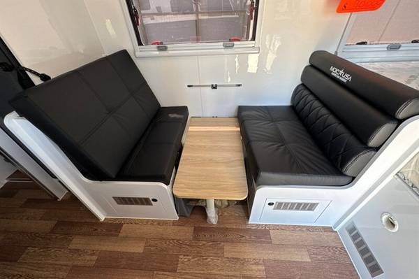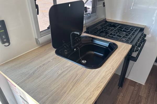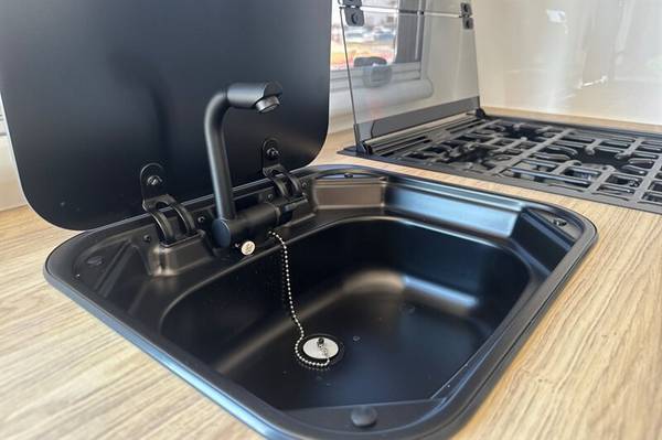 Prepare delicious meals on the go with the fully equipped kitchenette, complete with a stainless steel sink, gas cooktop, and ample storage for all your cooking essentials. The integrated fridge/freezer keeps your perishables fresh and your beverages cold, ensuring you have everything you need for a satisfying culinary experience wherever your travels take you. A hot water system and onboard water tank provide added convenience, allowing you to enjoy hot showers and clean dishes with ease.