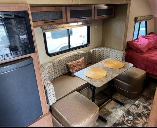 Rear Queen bed has a new 12-inch Pillow Top Hybrid Mattress (used one time). Kitchen comes with sink, refrigerator/freezer, microwave, 2 burner stove, pantry, U-dinette which converts into a full-size bed. Bathroom with toilet & shower. TV/DVD, entertainment center with stereo, indoor and outdoor speakers. Plenty of storage, Ice cold air conditioning & heating and more! Everything works wonderfully with no issues! Added back-up camera, electric jack, and additional storage shelves. The tires are like-new, the trailer comes with tons of miscellaneous items like a full size cover, heavy duty tow hitch with sway bar kit, blocks, chocks, and more!