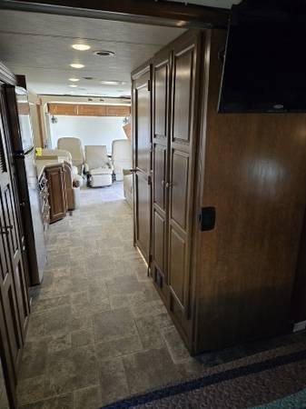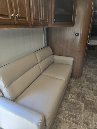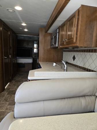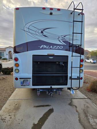 Presented for sale is this beautiful 2013 Thor Palazzo 33.2 "diesel-pusher" Motorhome. This coach is in very good condition with NEW upholstery. The coach is easy to operate measuring 35-feet in length, and 8.5-feet in width. It is powered by a 6.7-liter 300-horsepower Cummins engine backed by a 6-speed Allison transmission. The Motorhome features a fiberglass exterior with tinted windows, front protective film, full body paint, awning, slide toppers and painted stripes, so there is no fading or peeling from the vinyl decals used on cheaper coaches. The unit has plenty of room provided by a full wall slide-out and a bedroom slide-out, allowing for ease of movement throughout the coach. The bath features a porcelain toilet and a glass shower door. Relax in the comfortable queen-sized bed. Three LCD Televisions (one being an outdoor entertainment center) and a powerful 300-watt stereo radio with three subwoofers provide entertainment for the unit. And, for long-term camping, the unit features a stacked washer and dryer and residential refrigerator all powered by a 50 amp shore service outlet or the onboard 6,000 watt Cummins/Onan generator. There is also plenty of storage provided by a good amount of real-wood cabinetry throughout the coach. If you are new to diesel-pusher motorhomes you will be impressed by the front and rear air-ride suspension, air- brakes along with an engine brake for safer operation in the mountains. The coach is also equipped with a hydraulic leveling system and a tow-hitch rated at 10,000 pounds for towing all your toys behind the coach.