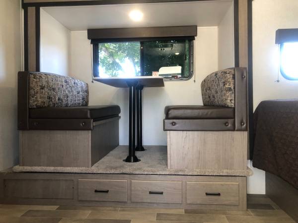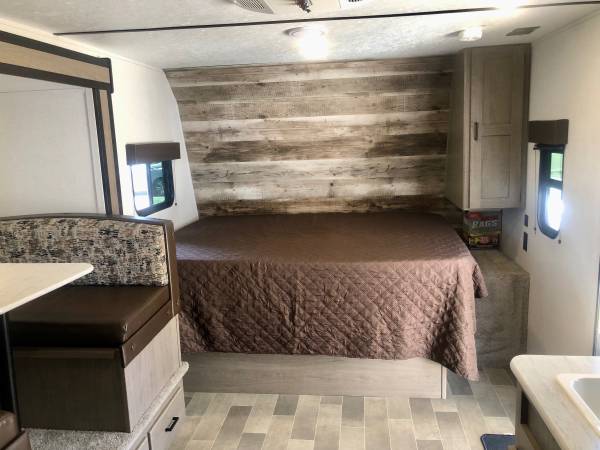 Sleeps 4 with a front queen bed, dinette/sleeper and slidout. Rear spacious bathroom with a large walk in shower, toilet, vanity with sink. Kitchen has a dual burner stove top, sink, microwave, fridge. Roof A/C unit, heater, power awning, AUX batter, propane tank, heavy duty entry step, solar panels and connection. Extras include: stabilizer bars, brand new 21 gallon portable holding tank (for black water), memory foam mattresses for beds, sheets included.