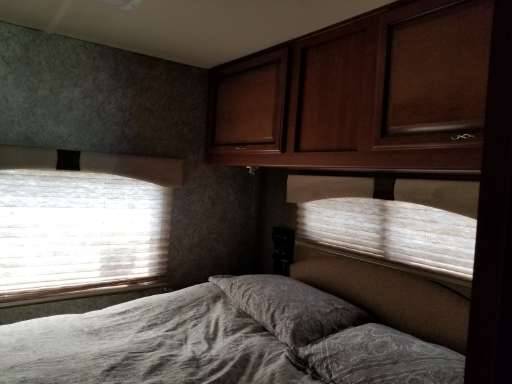 Great heating and cooling! The automatic thermostat heats the main cabin with a separate thermostat for the master bedroom (privacy with sliding door). A/C in both the engine and separate console which runs off the generator. East coast (cold weather) RV with defrosting mirrors, able to keep you warm in cold weather. Automatic or manual leveling jacks with just the push of a button.