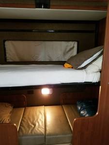There are plenty of overhead cabinets throughout this motor home for storage. There are many options available on this motor home, such as a bedroom/bunk area 19" LED TV, dual panel bunk bed monitors, hide-a-loft drop-down queen bed with 29" LED TV, an entertainment center with 32" LED TV or a dinette with swing-down bunk.