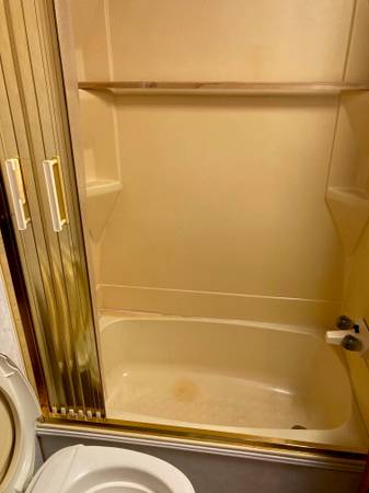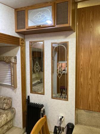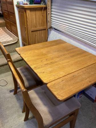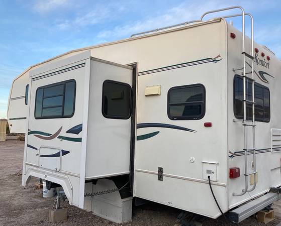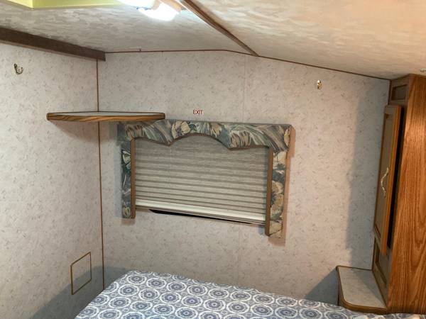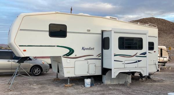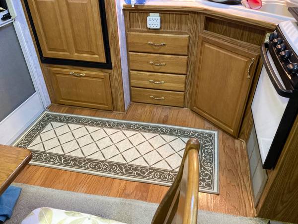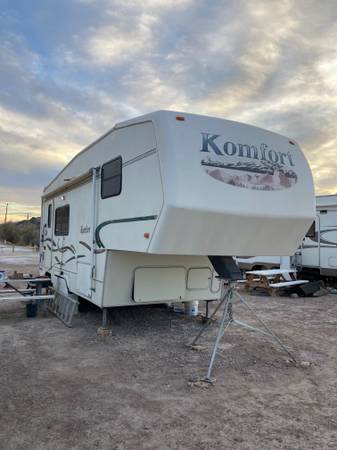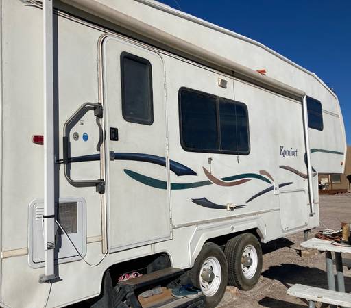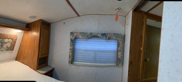 Very clean 5th wheel travel trailer, with queen size bed and spacious closets. Slide out living room has pull out futon. Full bathroom with vanity, sink, toilet and shower/tub. Full kitchen with refrigerator/freezer, microwave, sink, stove and hood vent. Includes dining table and two chairs.