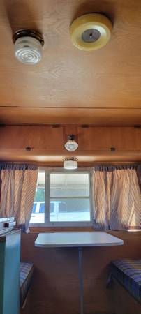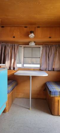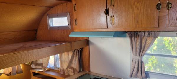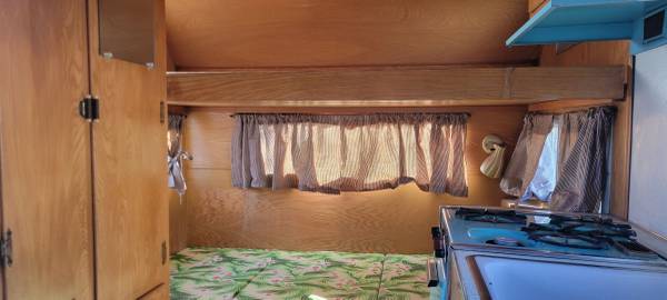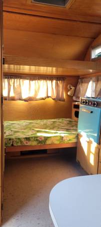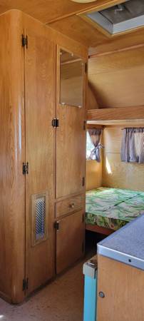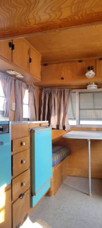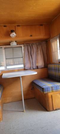 1964 Oasis vintage classic travel trailer ---- roughly 13 feet long cabin --- Project trailer --- NO bathroom The strong point is the very original Birchwood interior !--- very minimal past water...