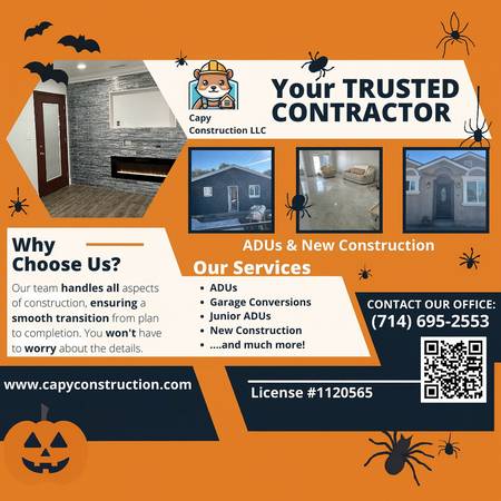 Capy Construction specializes in ADUs (Accessory Dwelling Units), Garage Conversions, and all new construction projects! With over 20 years of industry experience, we offer high-quality craftsmanship and personalized service to bring your vision to life.