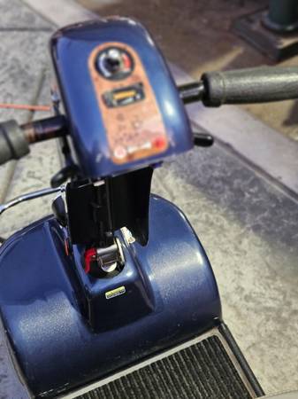 Shoprider Mobile Scooter in great shape lightly used, metelic blue, leather seat,new batteries, new tubes in tires, basket, seat swivels, adjustment forward and back on seat, armrests fold up, 300lb capacity,adjustable speed with charger, in great condition.