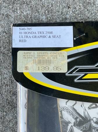 New, in original packaging. Graphics and gripper seat cover for 2001 TRX250R. N-Style N40-705. Store price was $139.95. Red and black. Get your quad ready for Glamis or the desert. Cash only.