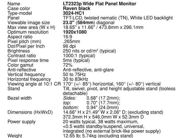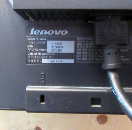 I am selling a used Lenovo 23-inch LT2323p Wide LCD Monitor. Model 3024HC1, Full HD (1920 x 1080) Monitor. Panel type: Twisted nematic (TN), with a white LED backlight. Display size: 23 inches (diagonal). Aspect ratio: 16:9. Item works great. Please see photos for more details and to assess the condition yourself. Also be sure and check out the other items I have for sale and message me if you want to combine orders. Thank You.