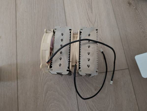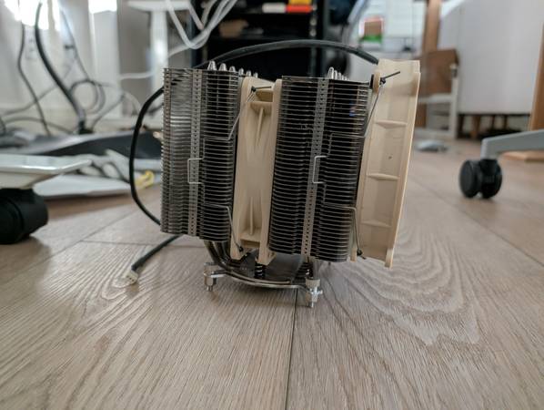 Selling an old Noctua NH-D14 that I had been shoehorning into a 4U case to cool a Xeon but finally switched to a smaller cooler so I stopped cutting my fingers every time I was working in the case (and to be clear, the NH-D14 does NOT fit in a 4U case). Tried to clean up the heatsink a bit and it would definitely benefit from a deeper cleaning of the fins, but otherwise the fans and heatsink are all completely functional.
