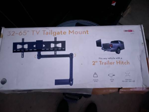TV Tailgate trailer hitch TV mount, fits 2” hitch receiver,, for your tailgate sports party, holds 32-65 inch TV, new in box. $60. No Email or text, call