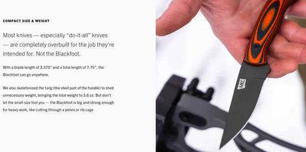 The Blackfoot’s drop point blade shape is key to its versatility. It has enough tip for easily caping out an animal or doing other fine work (yes, including those difficult tear ducts), but enough belly for skinning and deboning.