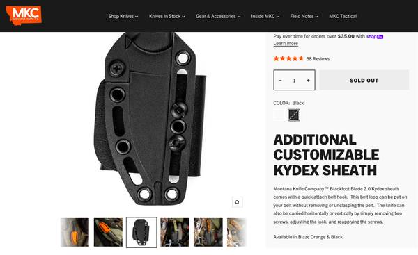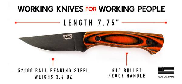 Brand new, never used Montana Knife Company Blackfoot 2.0 with a customizable MKC Open Carry Sheath 2.0 and Kydex clip that that allows the knife to be carried horizontally or vertically. Everything comes in the original box with MKC packaging, info cards and a sticker, so it's a perfect gift.