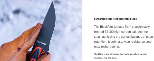 The Blackfoot is made from cryogenically treated 52100 high-carbon ball-bearing steel, achieving the perfect balance of edge retention, toughness, wear resistance, and easy resharpening. The blade is also parkerized to a matte black finish, which minimizes rust and glare.
