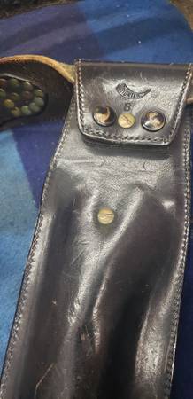 Number 8 stamped holster (no other markings as to model revolver, etc it's to fit) and unmarked old cartridge belt. There is no size or manufacturer on it I can see.