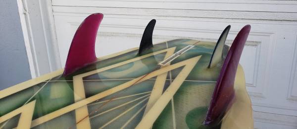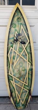 6'0"x 21" x 3" Early 80's quad plus one. Amazing geometric/wave airbrush done by Carper himself on both sides. Functional or an art piece (Or both!) All watertight and no open dings. John Carper is based out of Hawaii and has been a long time shaper for many high caliber surfers such as Shane Dorian. Very cutting edge board for it's time!!