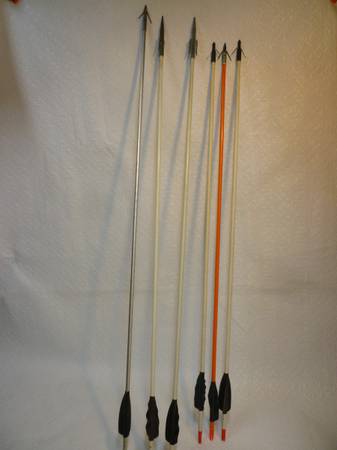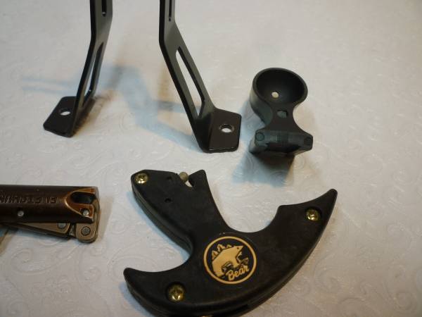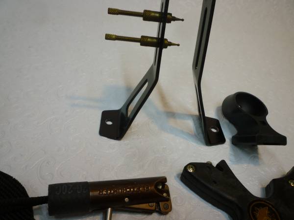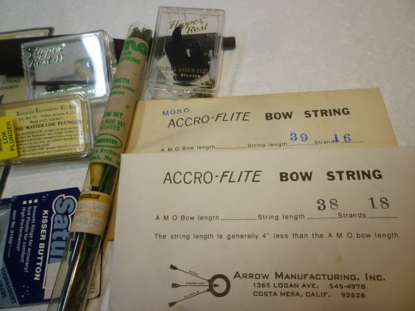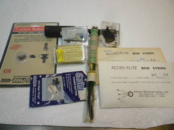 Many of the things a beginning or advanced archer uses. From a compound bow soft carry case. Then six arrows with tips to use with the two arrow reels . Many parts new and unused others like new and several are used. Two thumb releases, four Bear Jennings cable wheels, one zebco 808 spinning reel and lots more.