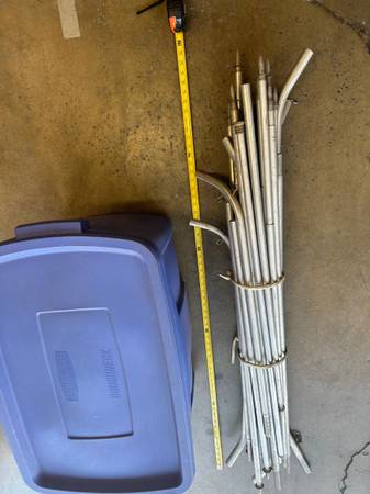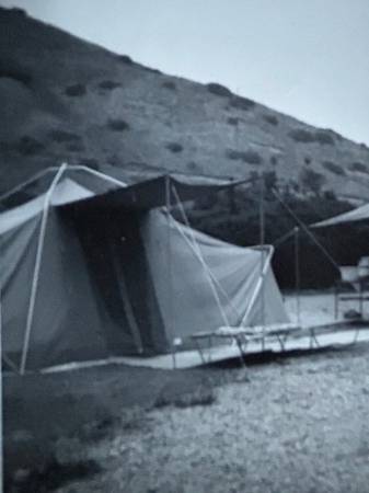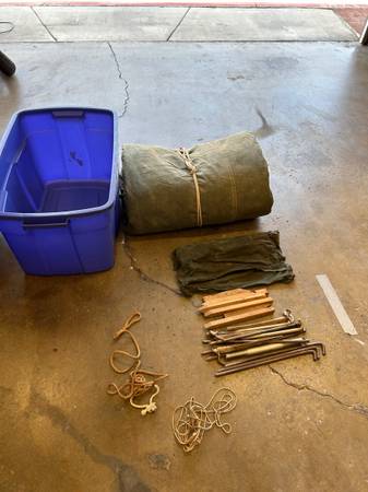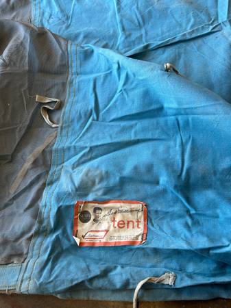 This is a fabulous, Vintage Sears Heavy Duty Canvas Cabin Tent that measures 9x17 feet. Two Internal walls can be utilized to make three rooms for privacy or either wall can be rolled up and create one large room. Comes with all aluminum poles plus stakes and storage box. This is an original owner generational tent and sold as is, the condition may be judged by the pictures, all window screens and zippers are in great condition, exterior top and walls of tent are in good condition no rips or holes, the floor has 3 or 4 small duct tape patches from sharp rocks seen in pictures normal wear and usage and you can message me with any concerns. Only asking $399.00. Cash only.