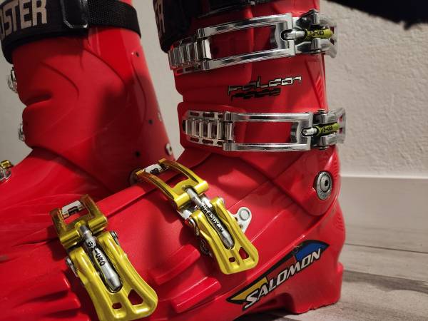 Salomon Falcon Race 120 alpine ski boots with after-market Booster strap. Size 29/29.5 (mondo point) or about US men's size 12. Sole is 336 mm. Excellent condition. Salomon S-Lab bright red. "MyCustomFit" race liner can be customized for fit. All buckles are original and working. Sole at toe and heal show some wear on bottom, but still lock into bindings. Factory flex rating is 120 and the Booster strap makes the boots stiffer and more responsive. Booster straps retail for around $50 on their own. Awesome boots!