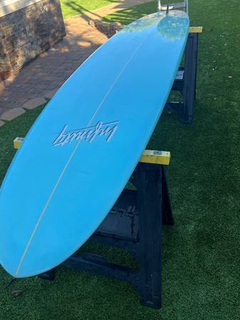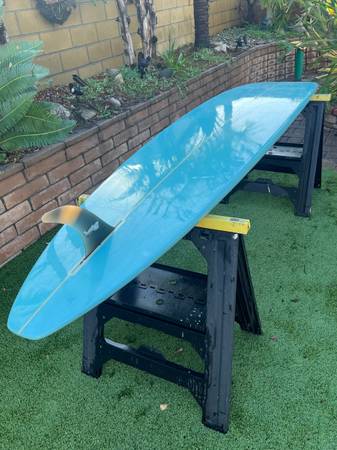 9 foot 6 in infinity classic long board-surf board Mint condition, single fin box. Clear glass with blue rails. No dings or damage. 9ft 6in x 22in x 2 1/4in. Shaped by cabbo. Price includes ocean...