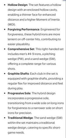 Great set of men’s #4-9 hybrid PW and traditional style Sand wedge. These are easy to hit and have a great feel with the hybrid style. I can meet up at the Rancho Mission Viejo or Ladera Ranch...