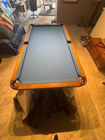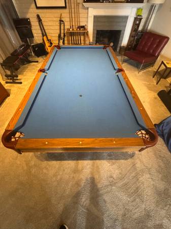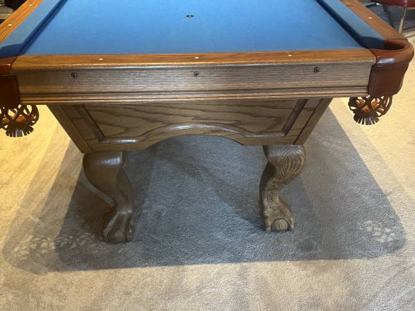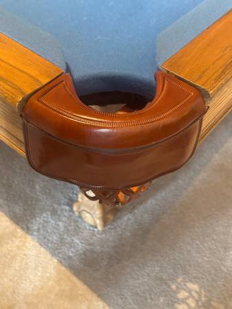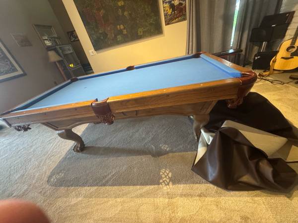 Custom-made 7 foot table brand new pockets and bumpers are in great shape. This was made in the 50s or 60s solid oak stand real Italian three-piece late. The person that set it up told me it’s a six to $8000 table not press board with a complete set of balls, sticks, etc. the cover what is $750